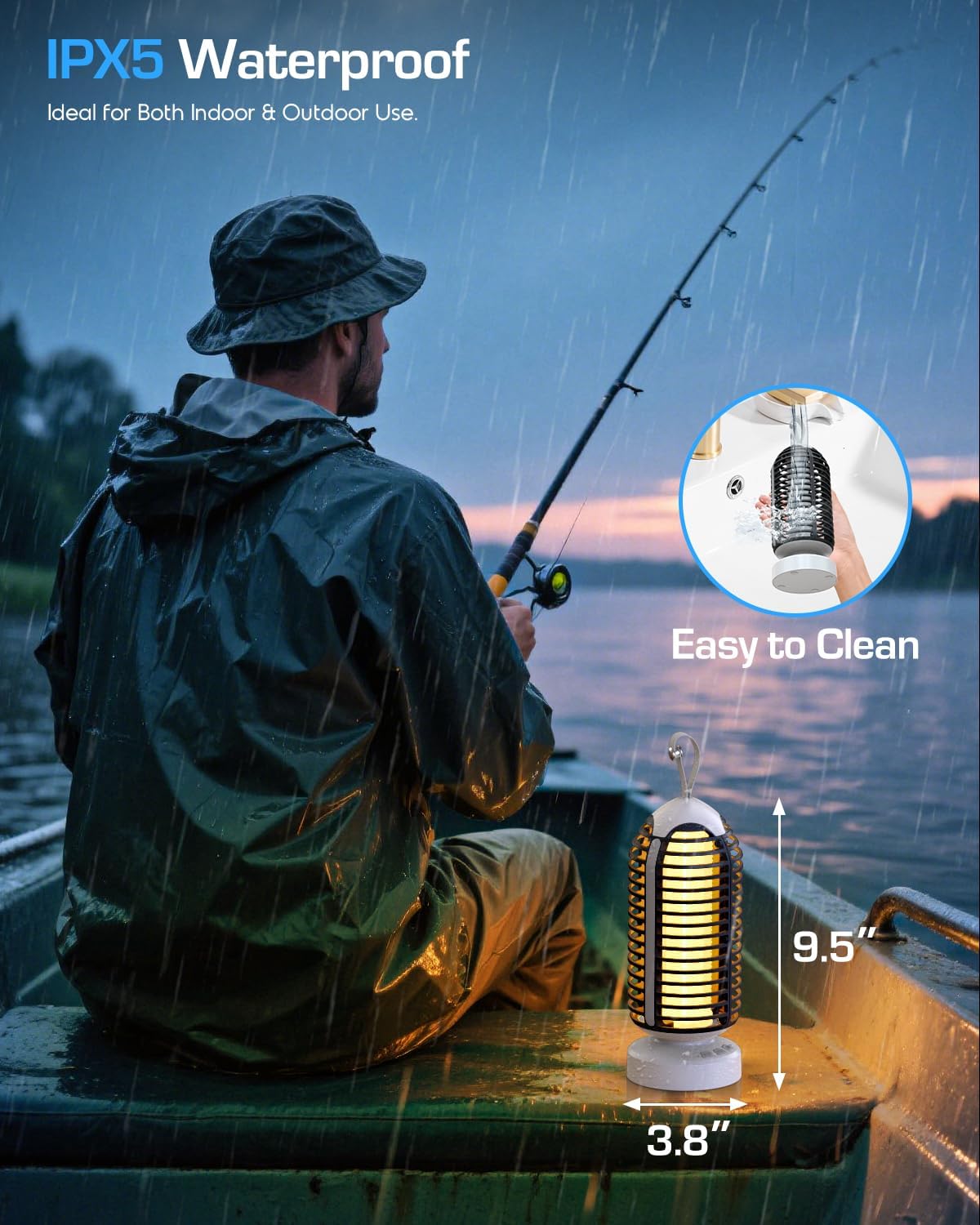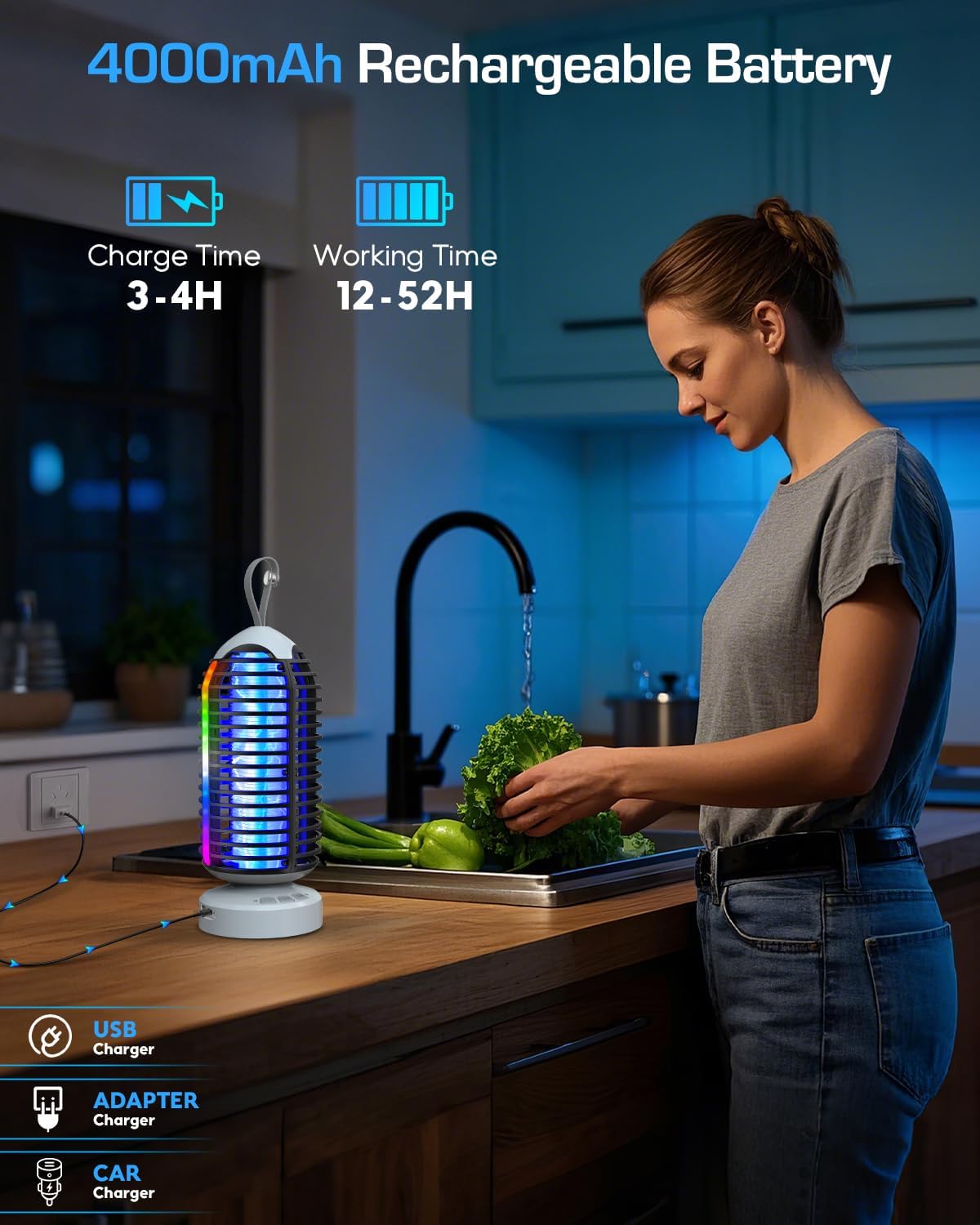 • 4000mAh Rechargeable Battery: This indoor fly zapper features a high-capacity 4000mAh battery, offering extended runtime: 12–16 hours in mosquito light mode, 7–18 hours in night light mode, and 17–52 hours in ambient light mode.With quick USB-C charging, it takes just 3-4 hours to fully recharge. Enjoy the freedom of cordless operation—whether at home or on the go, its portable, cordless design ensures continuous mosquito protection, letting you sleep peacefully without interruption.